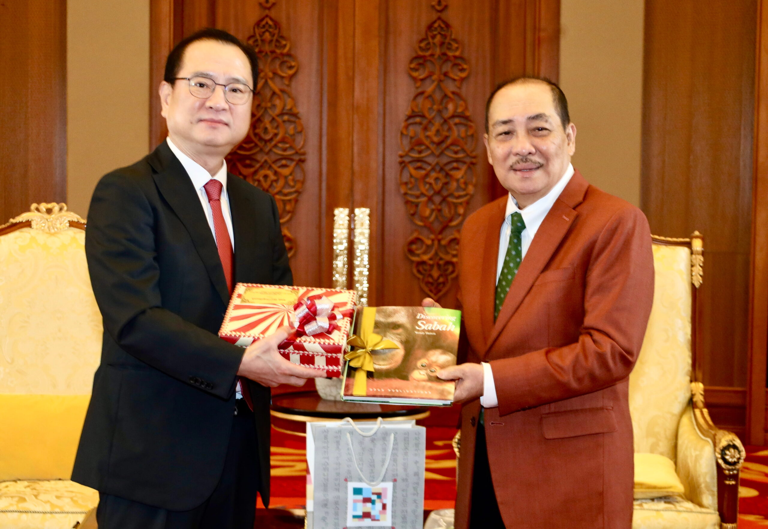 Hajiji presents a souvenir to Daerr during a courtesy call at Menara Kinabalu, and subsequently to Choi during a separate courtesy call.